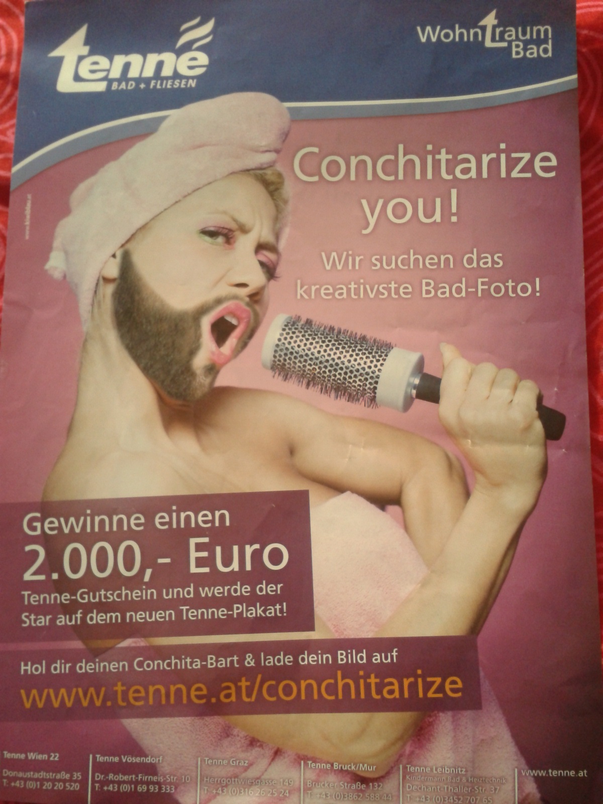 La prueba más clara de que su victoria ha calado en el público no eurovisivo puede verse en este anuncio de una empresa de azulejos austríaca. El que se conchitarize y envíe su foto a lo Conchita en su baño puede ganar 2 000 euros. El concurso ya ha acabado, así que no lo intentéis.