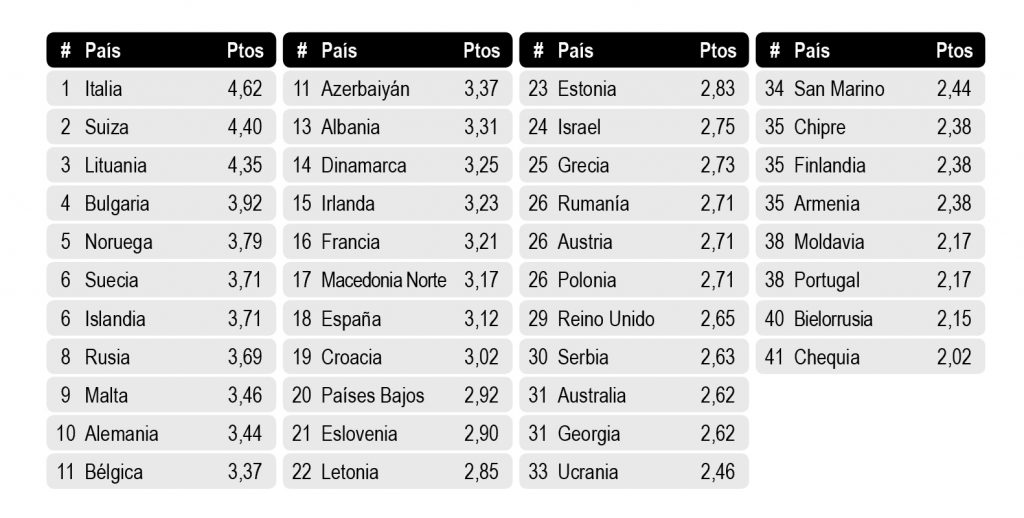 A pesar del tan extraño año eurovisivo que hemos pasado debido a la no celebración del festival por la pandemia del COVID-19, la tradicional euroencuesta de AEV no podía faltar. Hay que tener en cuenta que las valoraciones que hemos hecho los socios de las candidaturas se han basado en las interpretaciones disponibles en internet: las de los videoclips oficiales, las de las actuaciones en directo en las preselecciones, las de los «Eurovision Home Concerts»,… De haberse celebrado el eurofestival como estaba previsto, los resultados de la euroencuesta posiblemente habrían sido otros, pero eso… ¡nunca lo sabremos!