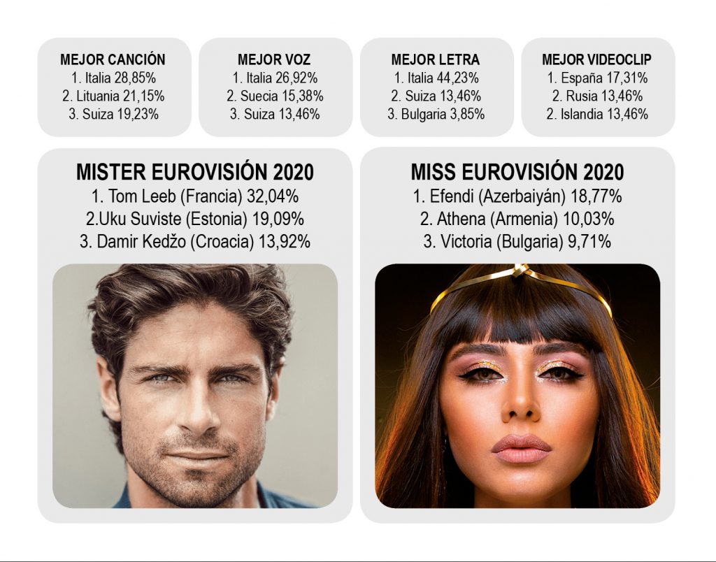 Y por supuesto, también hemos votado a las más y los más guapos de esta edición. La azerí Efendi consigue la victoria en la categoría femenina, aunque no con tanta rotundidad como la del francés Tom Leeb en su categoría, con una gran diferencia en votos respecto al siguiente clasificado, el estonio Uku Suviste.