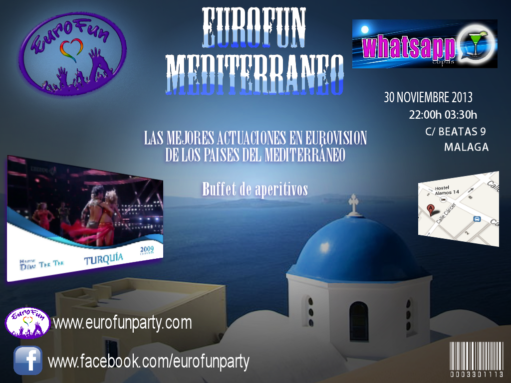 Tras su paso por Barcelona y Valencia, nuestros amigos de Eurofun celebran este sábado 30 de noviembre la fiesta Eurofun Mediterráneo por primera vez en Málaga que tendrá lugar en el Pub Whatsapp Copas, calle Beatas 9, de 22.00h a 03.30h. Cinco horas en formato audiovisual de las mejores representaciones de los países del Mediterráneo en el festival de eurovisión.Entrada gratuita. ¡Empieza a calentar motores para la nueva temporada eurovisiva! Os esperamos.