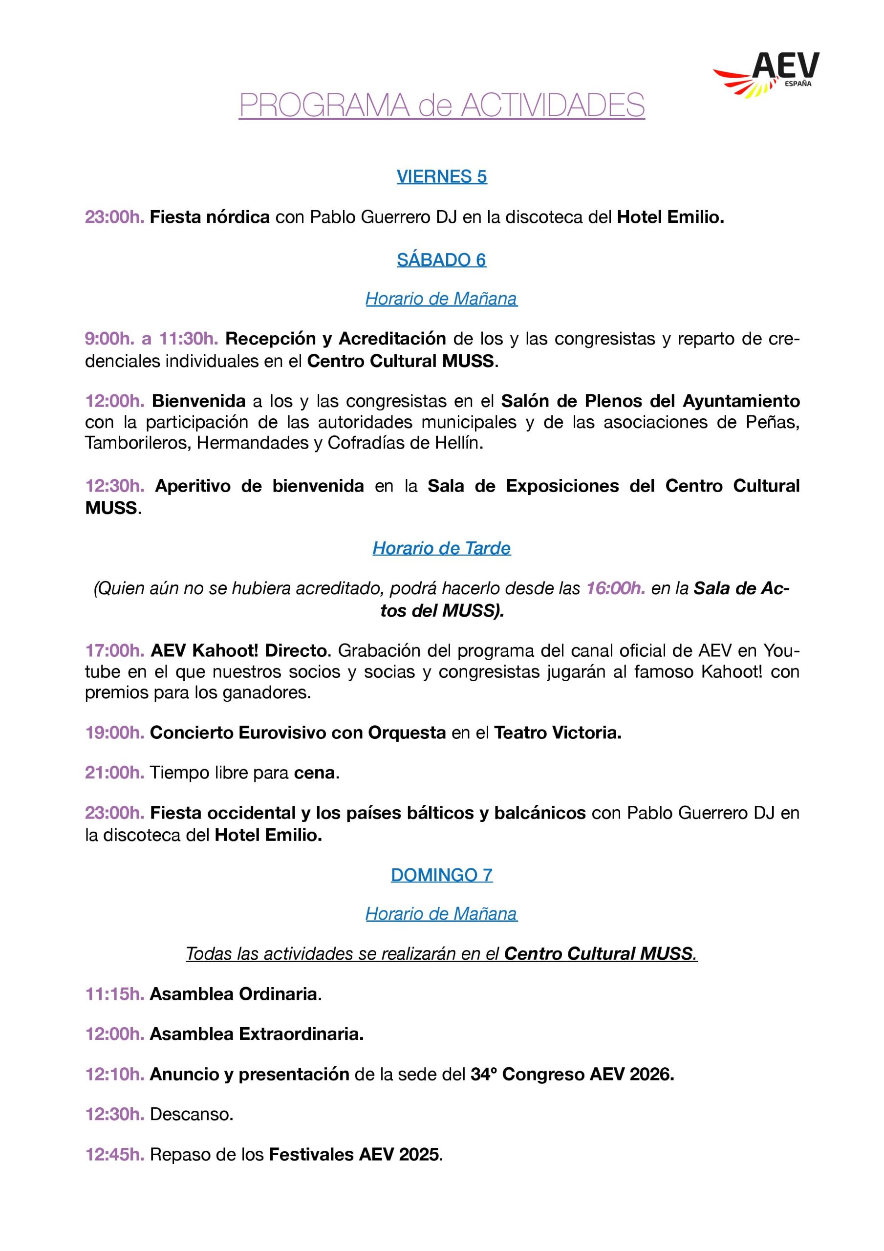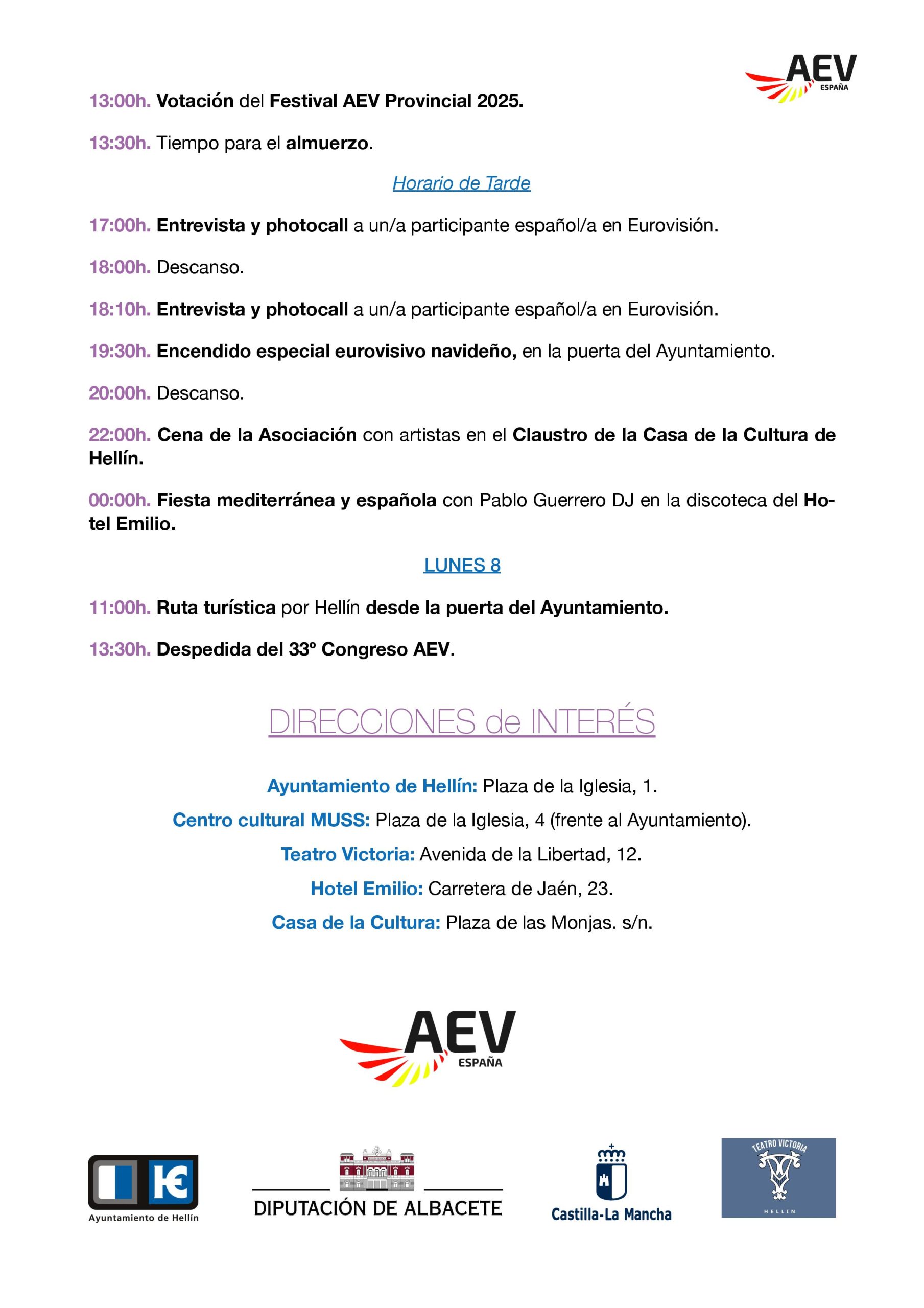 ¡Novedades sobre el XXXIII Congreso AEV! Como sabéis, nuestro próximo congreso tendrá lugar entre el 5 y el 8 de diciembre en la localidad de Hellín. A estas alturas, la Junta Directiva está ya en condiciones de confirmaros casi todos los detalles del congreso. De hecho, podéis encontrar adjunto el Programa de Actividades. Nuestro querido organizador, José Ángel Ruiz ‘Txule’, lleva meses trabajando para que sea un congreso muy interesante y lleno de actividades. De nuevo este año el congreso se organiza con el apoyo y la colaboración de entidades locales y diferentes instituciones que lo harán de nuevo una experiencia muy especial para todas las personas asistentes, tanto socias de AEV como no socias.