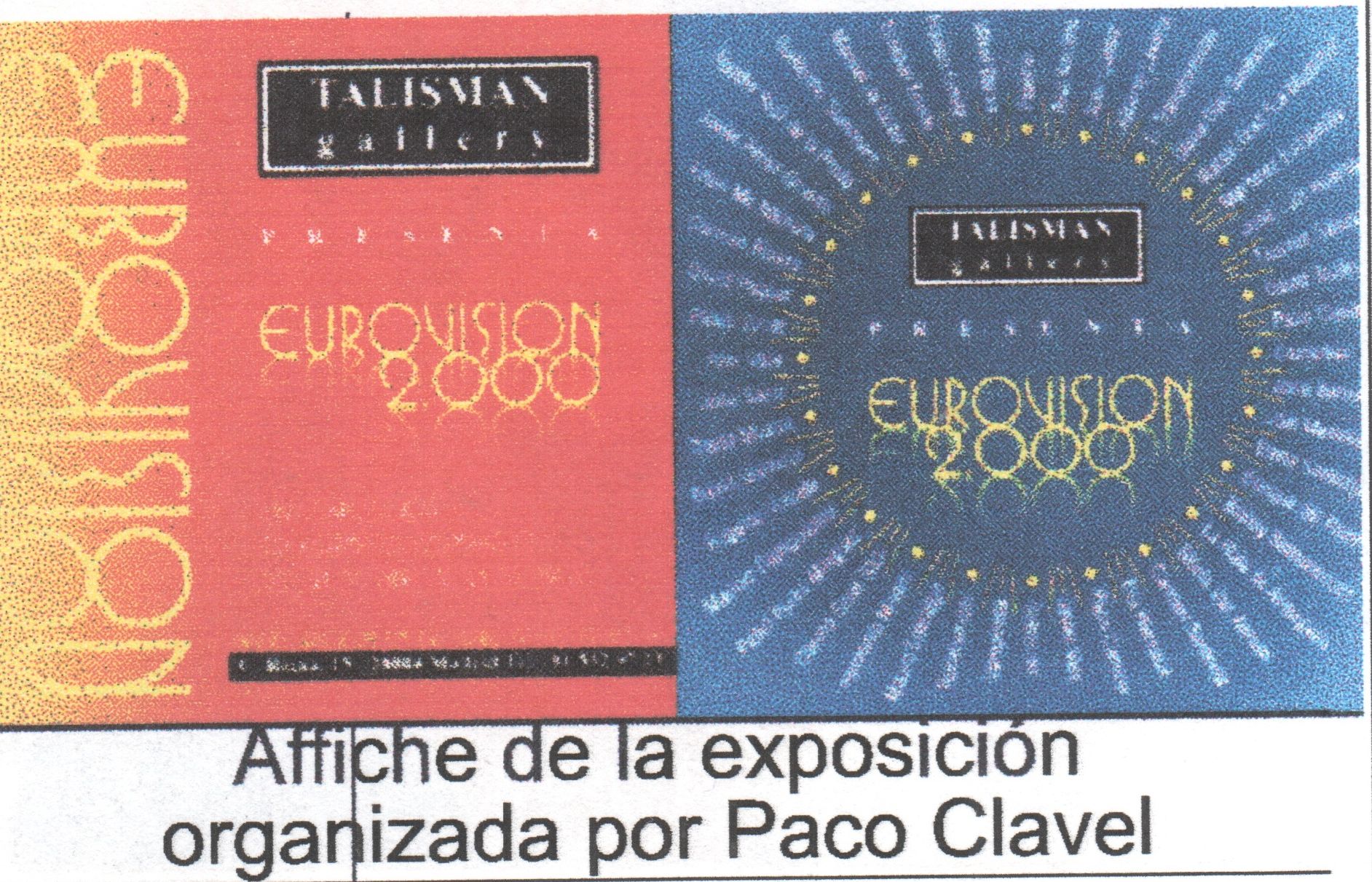La exposición de Eurovisión a la que hago referencia se llama Eurovisión 2000 y fue celebrada en la Talismán Gallery de Madrid, durante abril y mayo de 1998). Yo no vi la exposición, en la que algunos artistas recreaban la parafernalia de Eurovisión: Pablo Pérez Mínguez, Txomín Salazar, Equipo Límite, Javier Pérez Grueso (ex Radio Futura), Herminio Molero (otro ex Radio Futura), Fabio Mcnamara, Manolo Campoamor (ex Kaka de luxe), Vainica Doble (Gloria Van Aersen y Carmen Santonja), Elena Santonja (la de Con las manos en la masa, hermana de media Vainica Doble), Ágatha Ruiz de la Prada, Guillermo Summers, Enrique del Pozo, etc. Aquí veis algunos de esos trabajos.